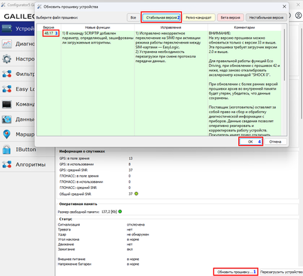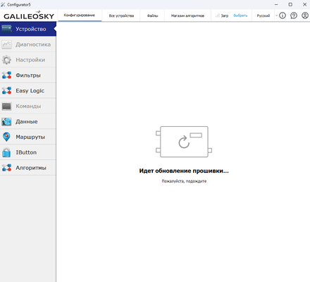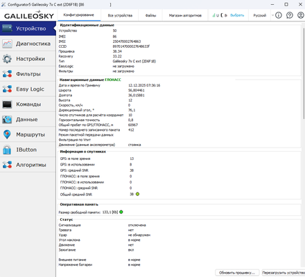Перед настройкой прибора желательно обновить его прошивку. На данный момент актуальная прошивка 48.17 (свериться с актуальным списком можно по ссылке: https://galileosky.ru/podderzhka/konfigurator/). В моём случае попался прибор с 38.34.