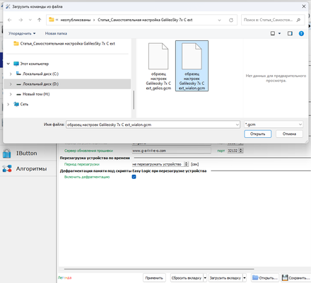 Теперь можно приступать к настройкам. Можете в прибор залить готовые настройки: «образец настроек Galileosky 7x C ext_wialon.gcm (в zip)». Для этого необходимо на вкладке «Настройки» в нижнем правом углу конфигуратора нажать «Открыть…» и загрузить необходимый Вам файл настройки, предварительно распакованный из архива, далее нажмите «Открыть».