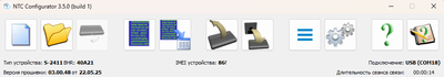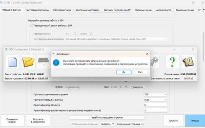 Перед тем, как вставить подключенный жгут проводов прибора в разъём, необходимо установить sim-карту с отключенным запросом PIN-кода, для чего необходимо нажать на жёлтую кнопку выталкивателя sim-карты (использовал МТС). Затем следует подключить фишку жгута в разъём до фиксации. Теперь нам понадобится мобильный компьютер с установленным Windows 11, а также шнур USB-mini-USB для программирования устройства контроля транспорта и софт: ntc_configurator_last_3.5.0.exe (в zip архиве) (тестировалось в Win11 64-bit). Если Ваш прибор не определяется, то возможно необходимо будет установить драйвер: Drivers_Navtelecom или пробовать ранние версии конфигуратора. Сначала установите конфигуратор. Для этого необходимо запустить самораспаковывающийся архив «ntc_configurator_last_3.5.0.exe» с отключенным от USB прибором. Подробнее о подобной установке можно прочесть в статье «Подключение трекера Смарт S-2433». После запуска конфигуратора можно подключить прибор по USB.
