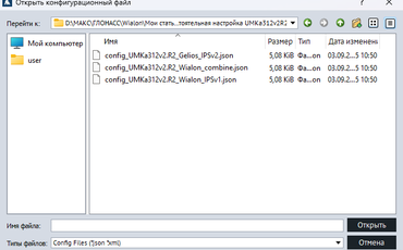 Далее выбрать предварительно скачанный и распакованный файл конфигурации «config_UMKa312v2.R2_Wialon_combine.json (в zip архиве)» или «config_UMKa312v2.R2_Wialon_IPSv1.json (в zip архиве)» и нажать «Открыть». Затем кликнуть на кнопку «Записать конфигурацию в терминал» также в левой части конфигуратора.