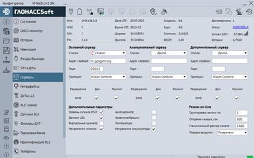 В разделе «Серверы» можно сменить настройки сохранения трека и выбрать, отметив знаком «ü», какие данные отправлять на сервер мониторинга.